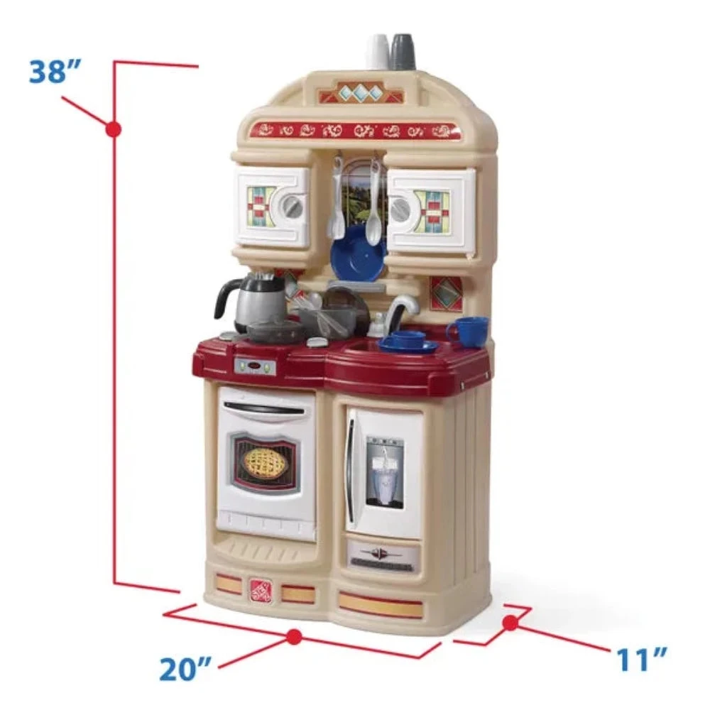 The compact design of this kitchen playset includes all of the realistic kitchen features you’d expect in a pretend play kitchen! Great for junior chefs just learning their pretend play cooking and baking skills, little ones can explore fun features like the working oven and refrigerator doors, pretend to wash the dishes in the molded-in sink with faucet, and more! Entertaining guests? Make a fresh pot of coffee with the molded-in coffee station and coffee pot. Kids can get cooking with the kitchen playset’s stovetop feature, with a fun clickable knob for added sensory play. And although this pretend play kitchen is a smaller model, it’s definitely not short on storage space! Made in USA of US and imported parts.