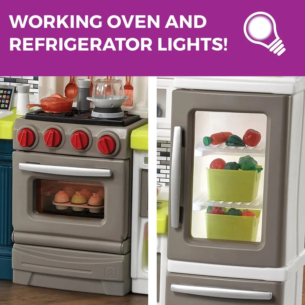 - Realistic electronic features include stovetop lights and sounds, and working oven and refrigerator lights (requires 5 “AA” and 6 “AAA” batteries, not included).