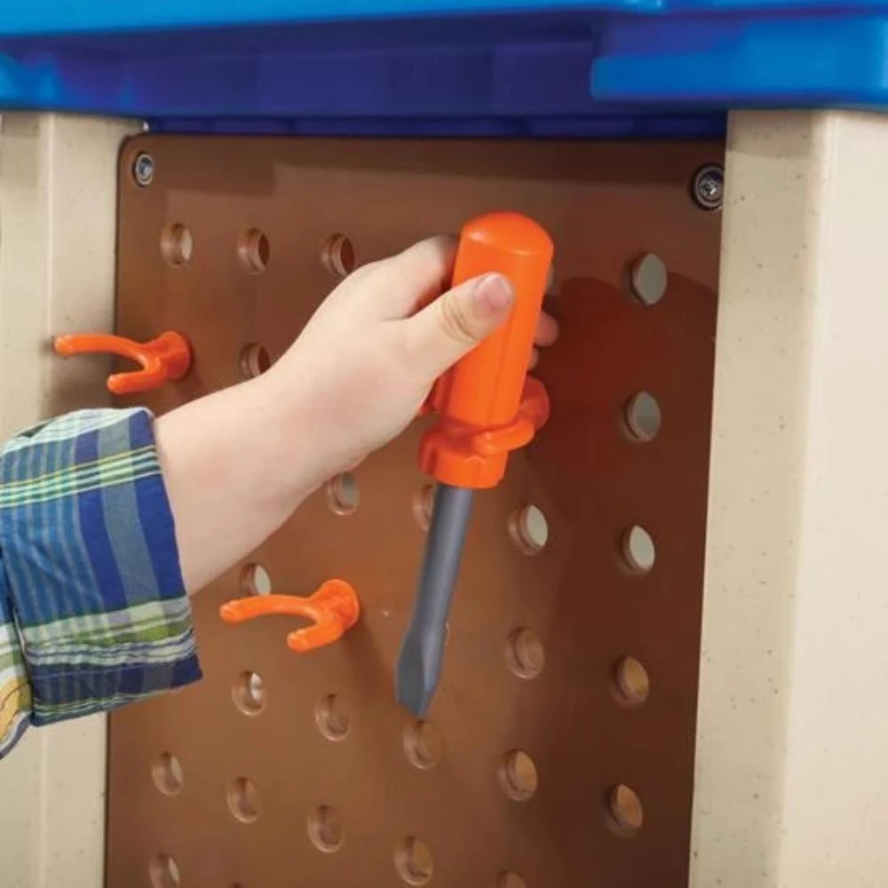 - The peg board and hooks to hang tools on the back wall will help children learn how to stay organized
