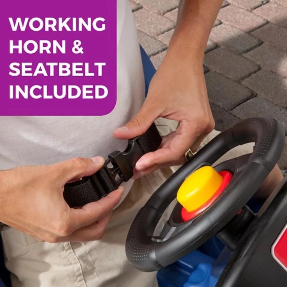 - Realistic steering wheel features a working horn for little drivers to alert others to share the sidewalk!