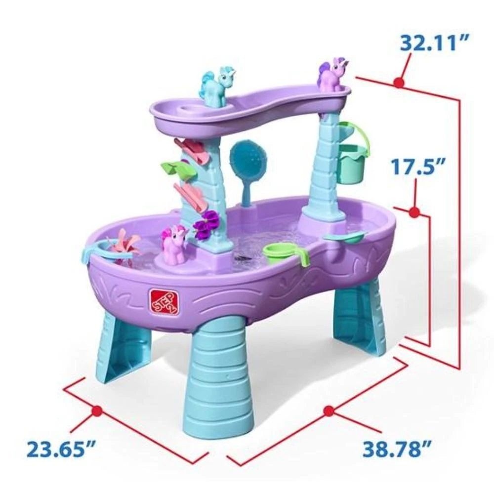 Create a magical splash with the Rain Showers & Unicorns water table! This spacious kids’ play table is big enough for multiple kids to explore the fantastic fun of their very own unicorn utopia. This kid’s water table with a cute unicorn theme includes three adorable unicorn characters, among an assortment of other fun accessories. Little unicorn lovers can make the unicorns swim and play in this pastel paradise, as they explore a wide variety of engaging features that challenge their fine motor skills. The large bucket lets kids scoop water from the magical pond and pour into the top tier to create a realistic rainfall effect. Maze-like spinners and buckets activate with the water splash, making a fantastic cascade below! Made in the USA of US and imported parts.