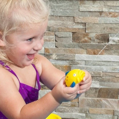 This multi-level kids water table is perfect for outdoor sensory play! Fill the top activity pool and the lower water table, then send the swimmer figure to dive off the springboard or create a cascading waterfall off of the top tier. The included flipper is designed for small hands to flip the sea creature figures into the pool, challenging their hand-eye coordination and fine motor skills. And, multiple kids can play together with so many ways to splash around thanks to the spacious design. Playtime can last for hours with the included umbrella providing some much-needed shade on hot, sunny days! Made in the USA of US and imported parts.
